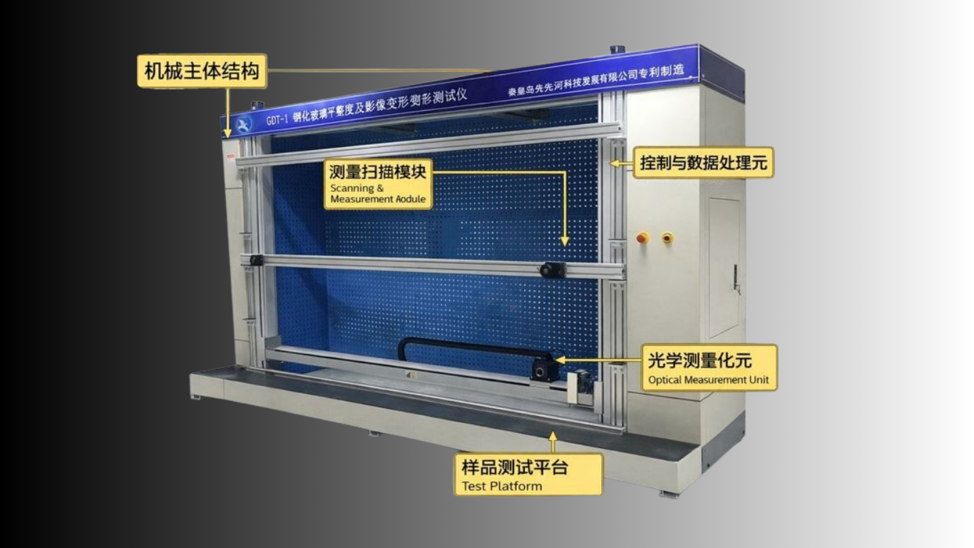 由机械结构、光学测量模块、样品测试平台、控制与数据处理单元及软件系统组成的完整检测系统,用于钢化玻璃平整度与影像变形的稳定、精确测量。